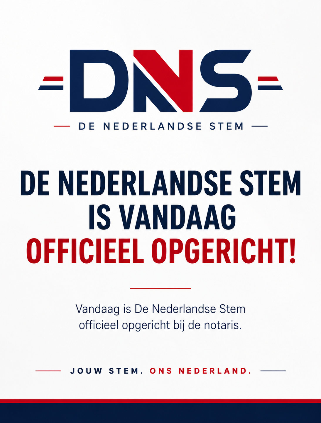 Vandaag is De Nederlandse Stem officieel opgericht bij de notaris. Daarmee is een belangrijke stap gezet in de vorming van een nieuwe politieke beweging die zich inzet voor een sterker, eerlijker en vrijer Nederland.